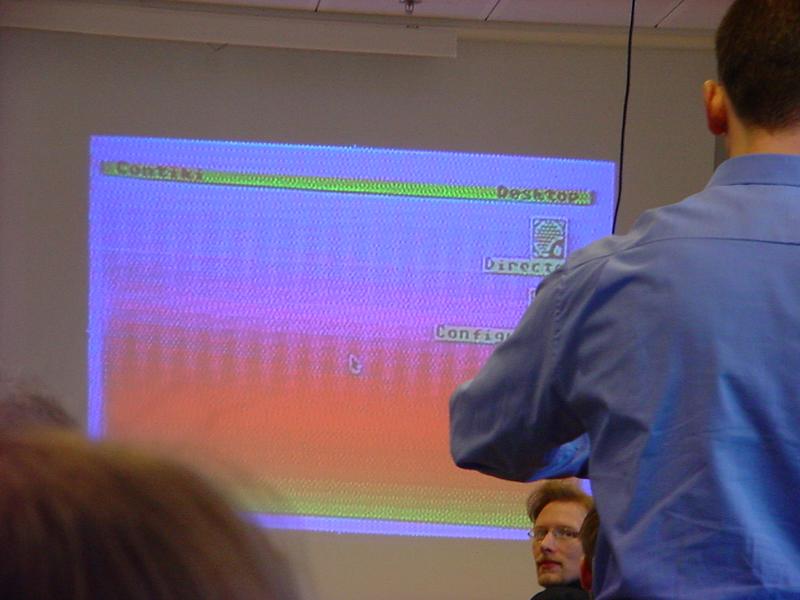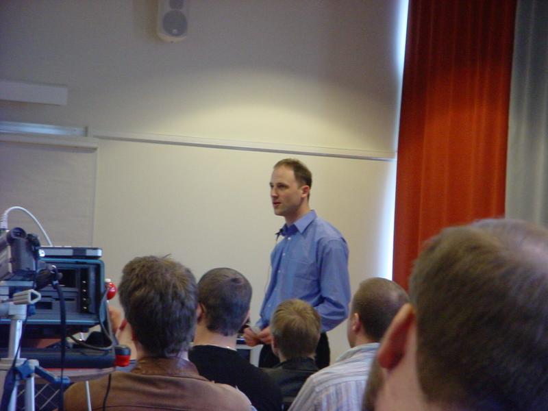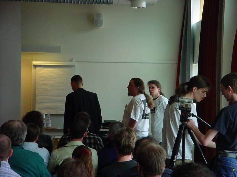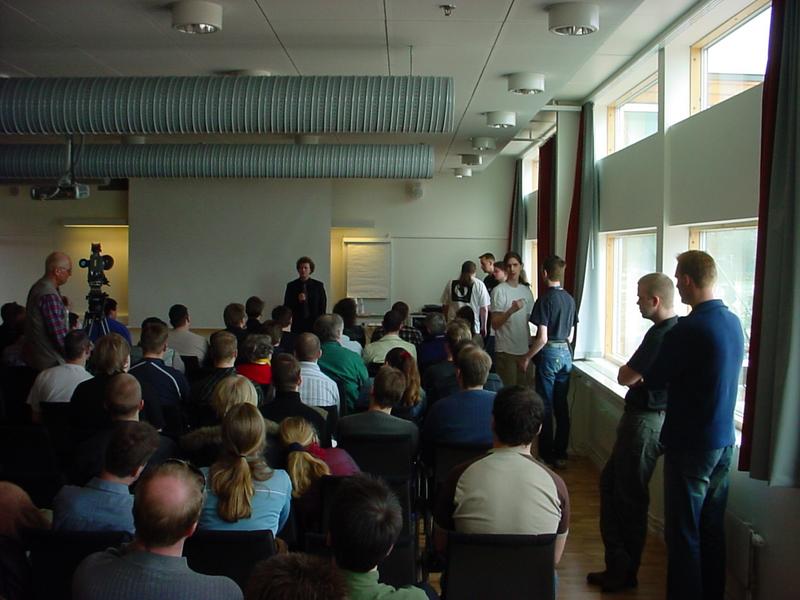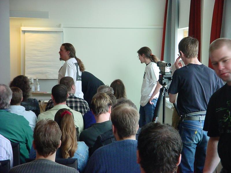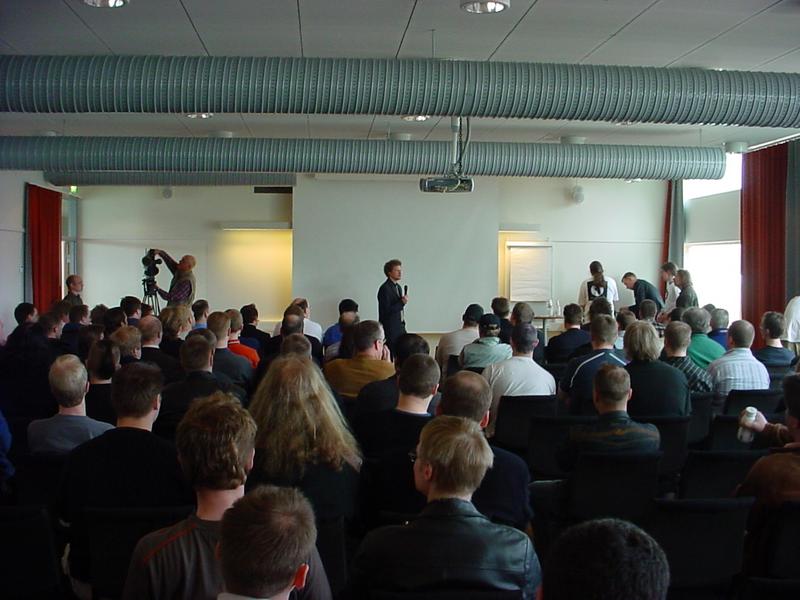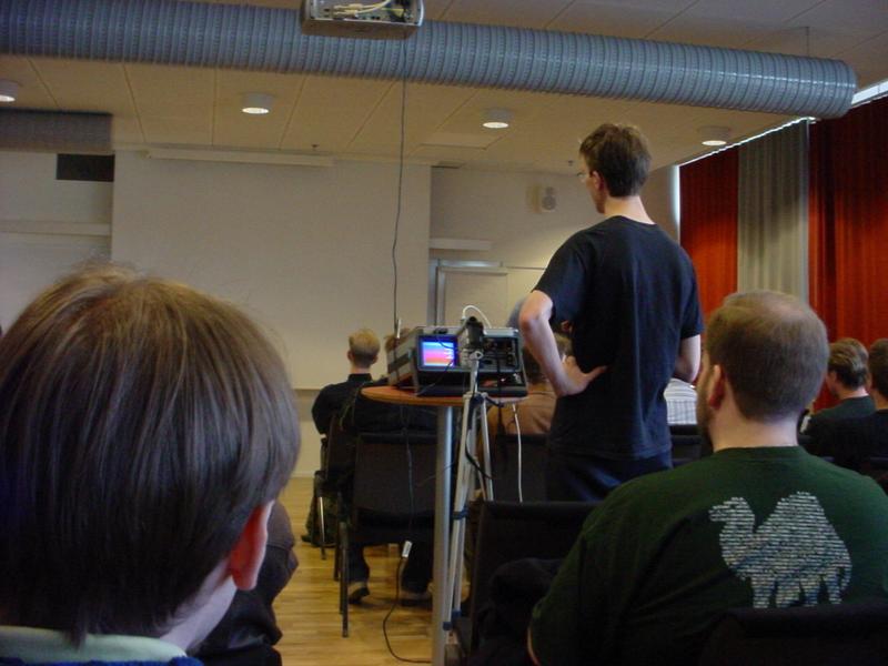 (800x600, 66 kB) A crowd has gathered for the AROS presentation. Stefan Nordlander is stalling