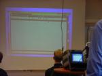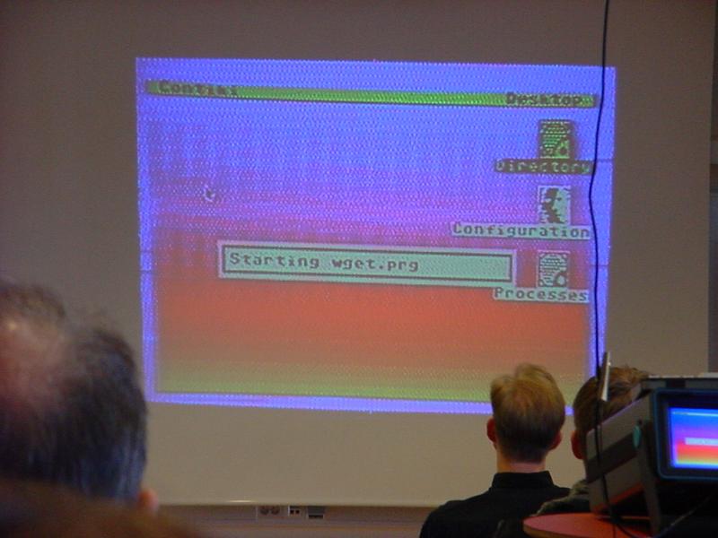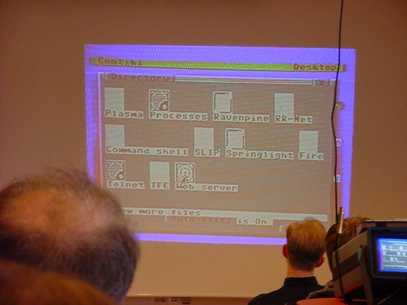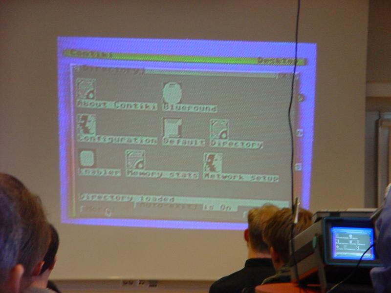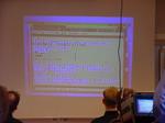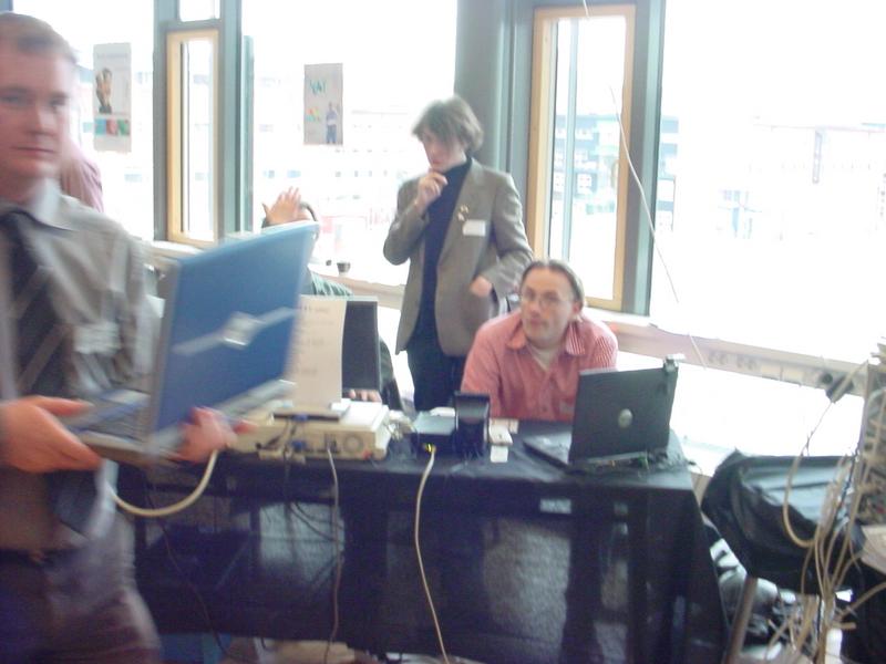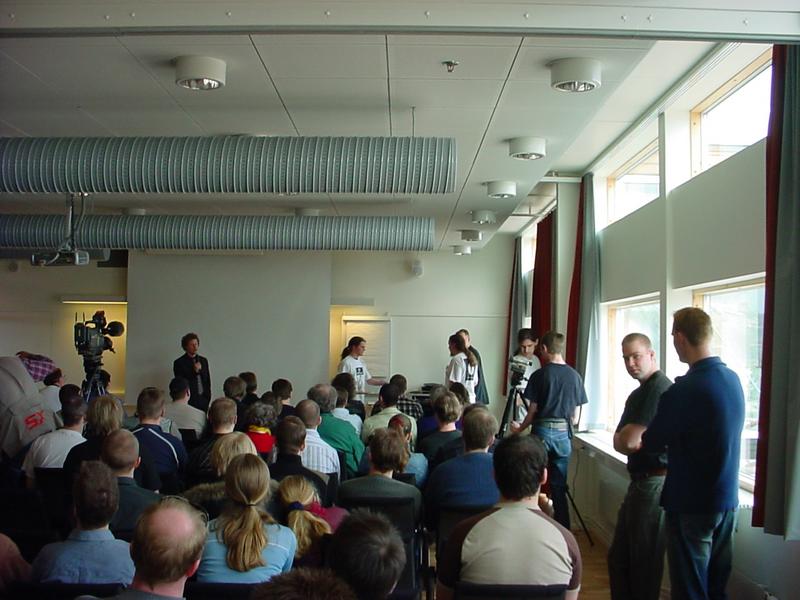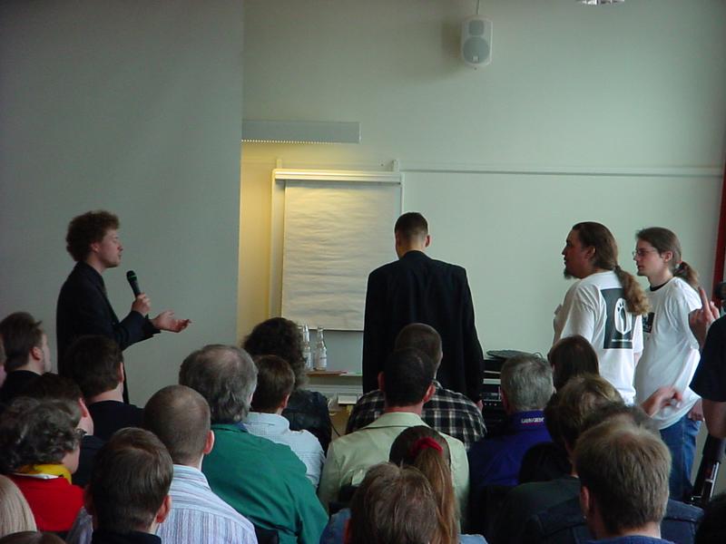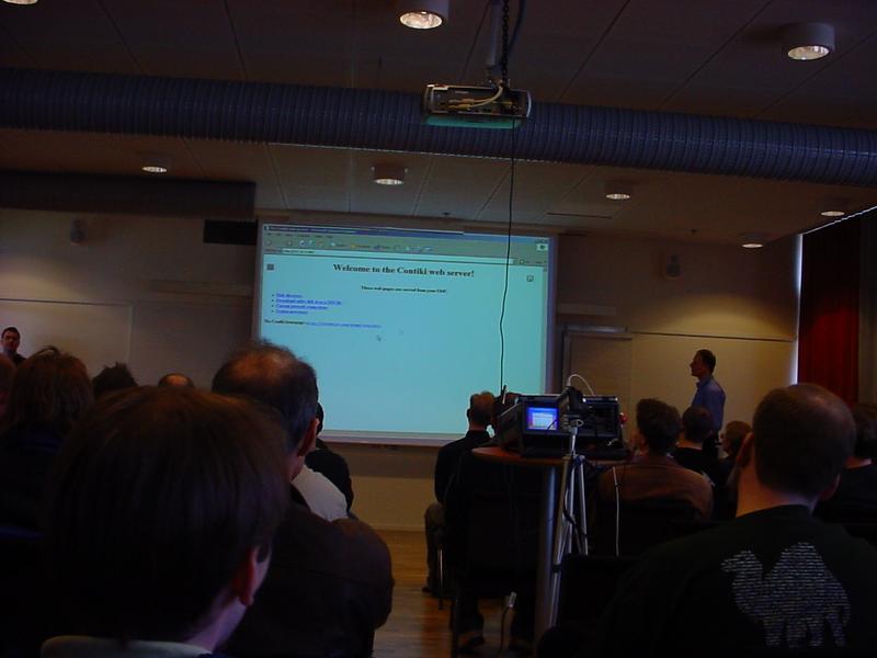 (800x600, 66 kB) A crowd has gathered for the AROS presentation. Stefan Nordlander is stalling