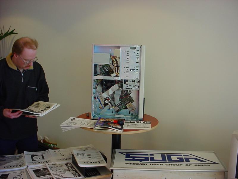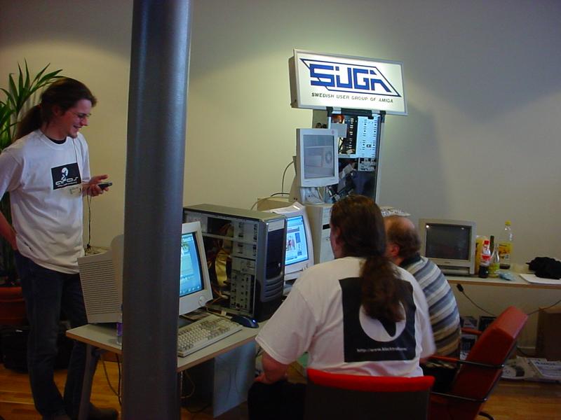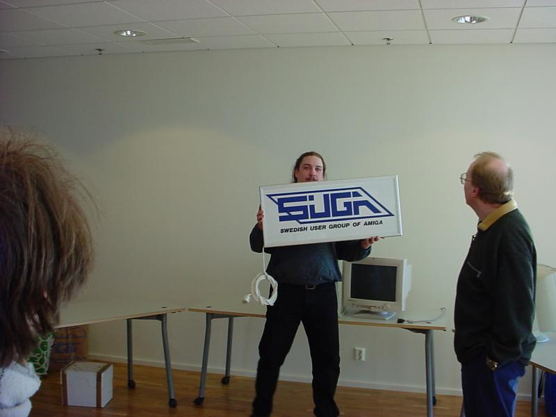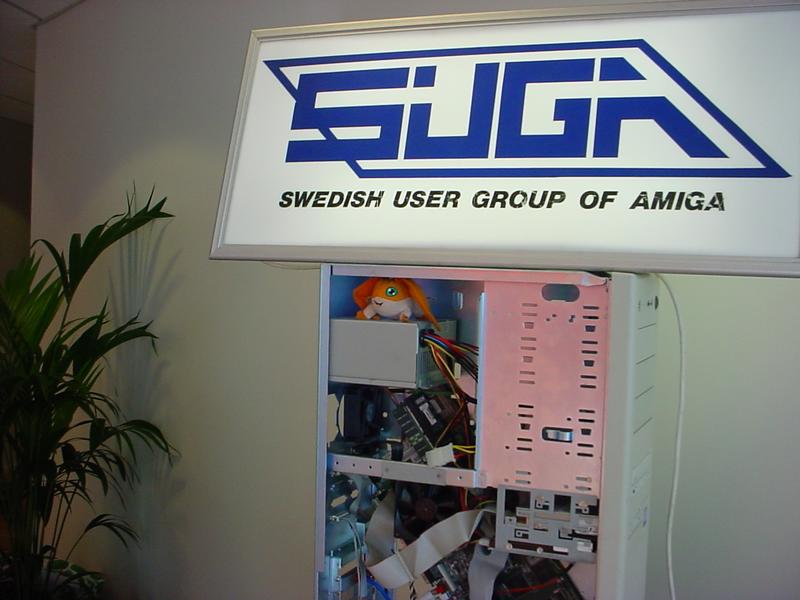 (800x600, 42 kB) Testing the SUGA sign in place on top of the Amiga 1200. That's Kjell Lindén