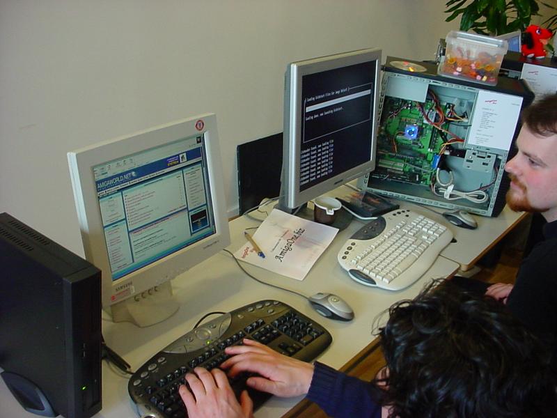 Lindén. Computers from left to right: AmigaONE, Pegasos, A1200.