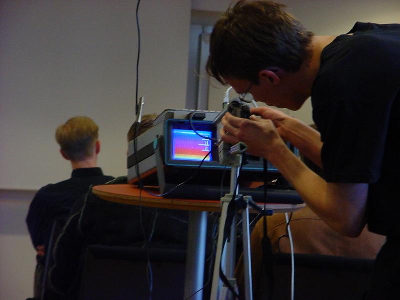 (800x600, 52 kB) Trying to get the projector working. That's me in the middle (second from